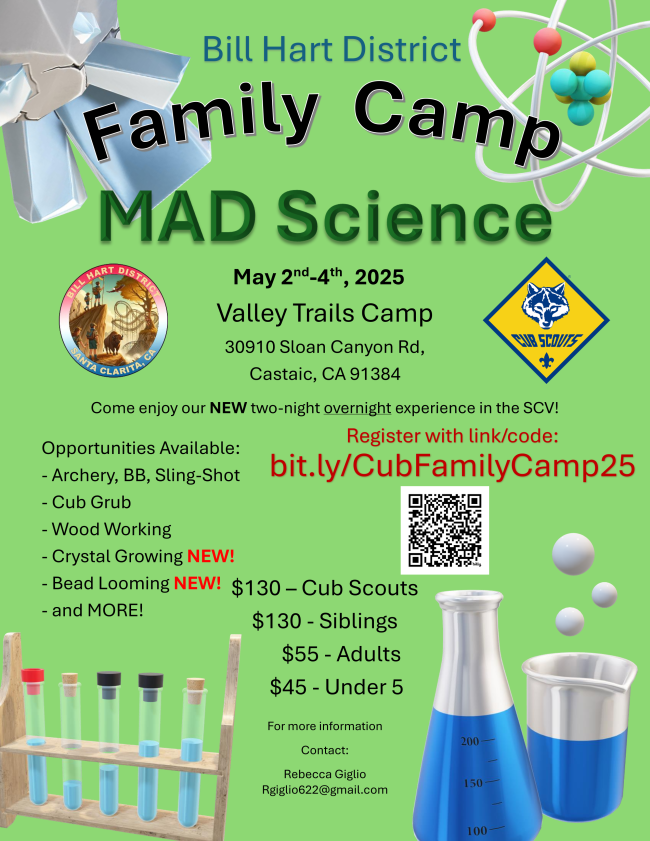 Activities that will be available include: Archery, BB, Slingshot, Woodworking, Crystal Growing, Tie Dying, Cub Grub, Swimming and More!